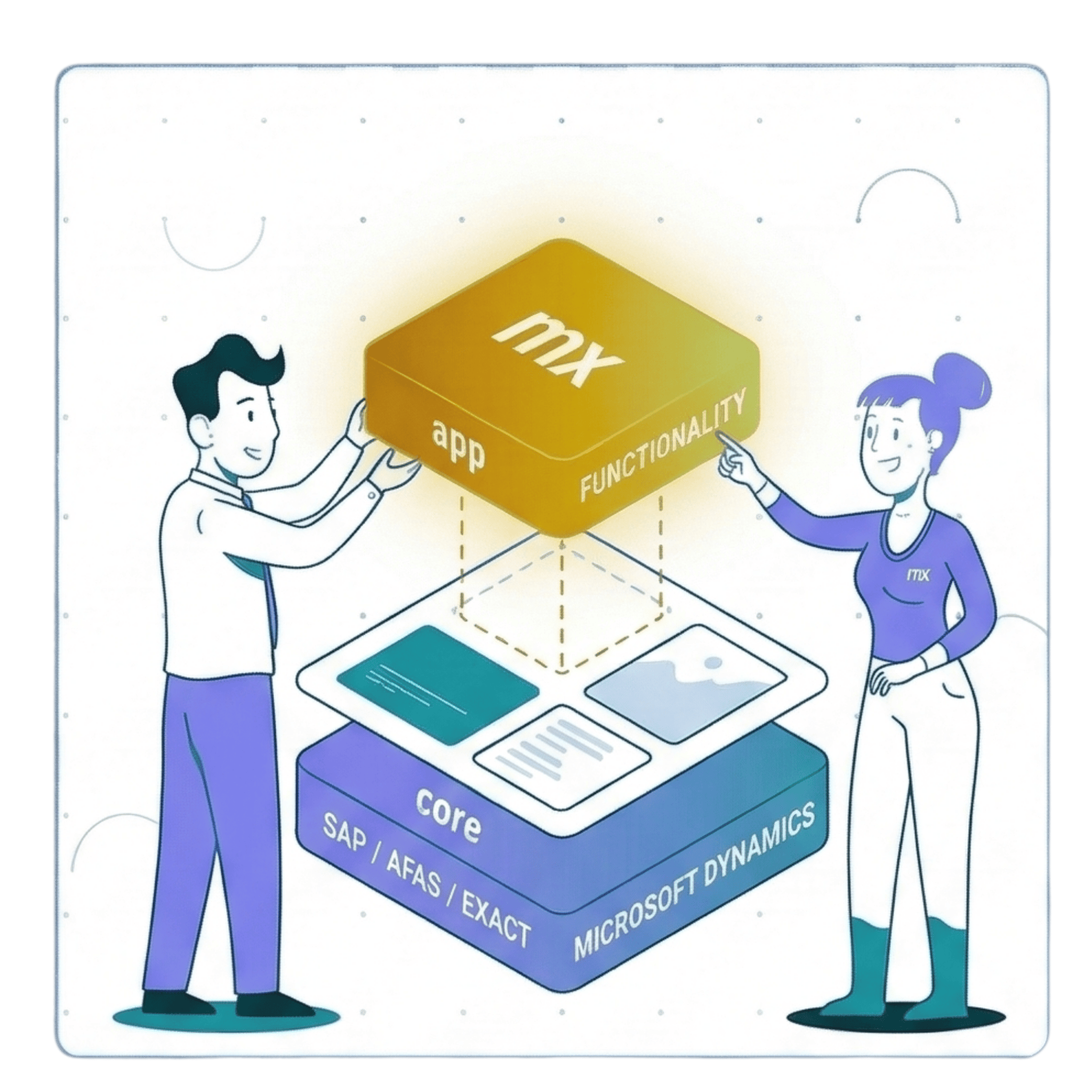 ERP-extensies: Haal meer uit systemen zoals SAP, AFAS, Exact of Microsoft Dynamics. Er worden maatwerk functionaliteiten 'on top of' het ERP gebouwd zonder de kern (the core) te vervuilen.